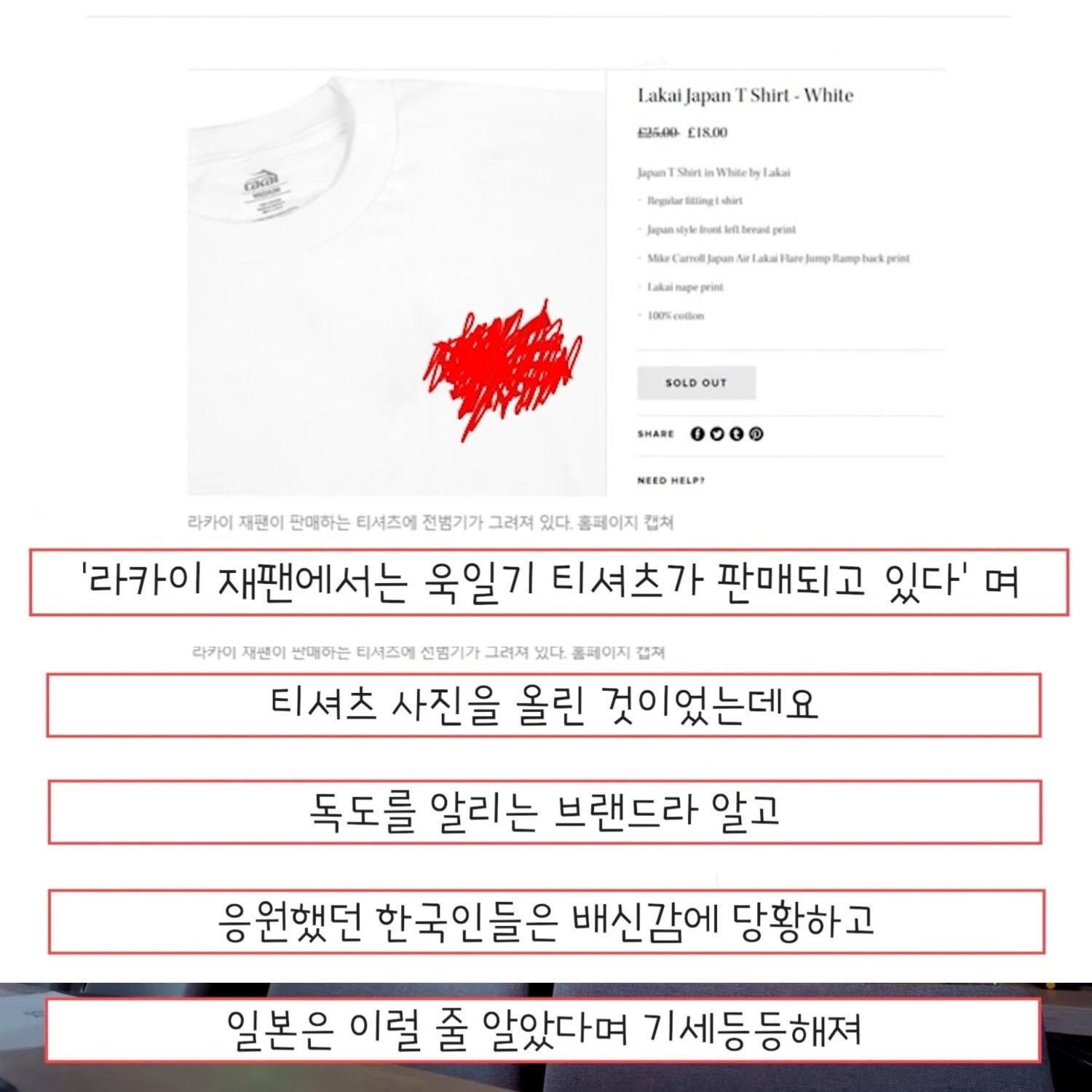 그러던 중 라카이 재팬에서 욱일기 티셔츠를 판매하고 있다는 글이 올라왔고 일본인들은 그럴줄 알았다며 비웃었습니다.
