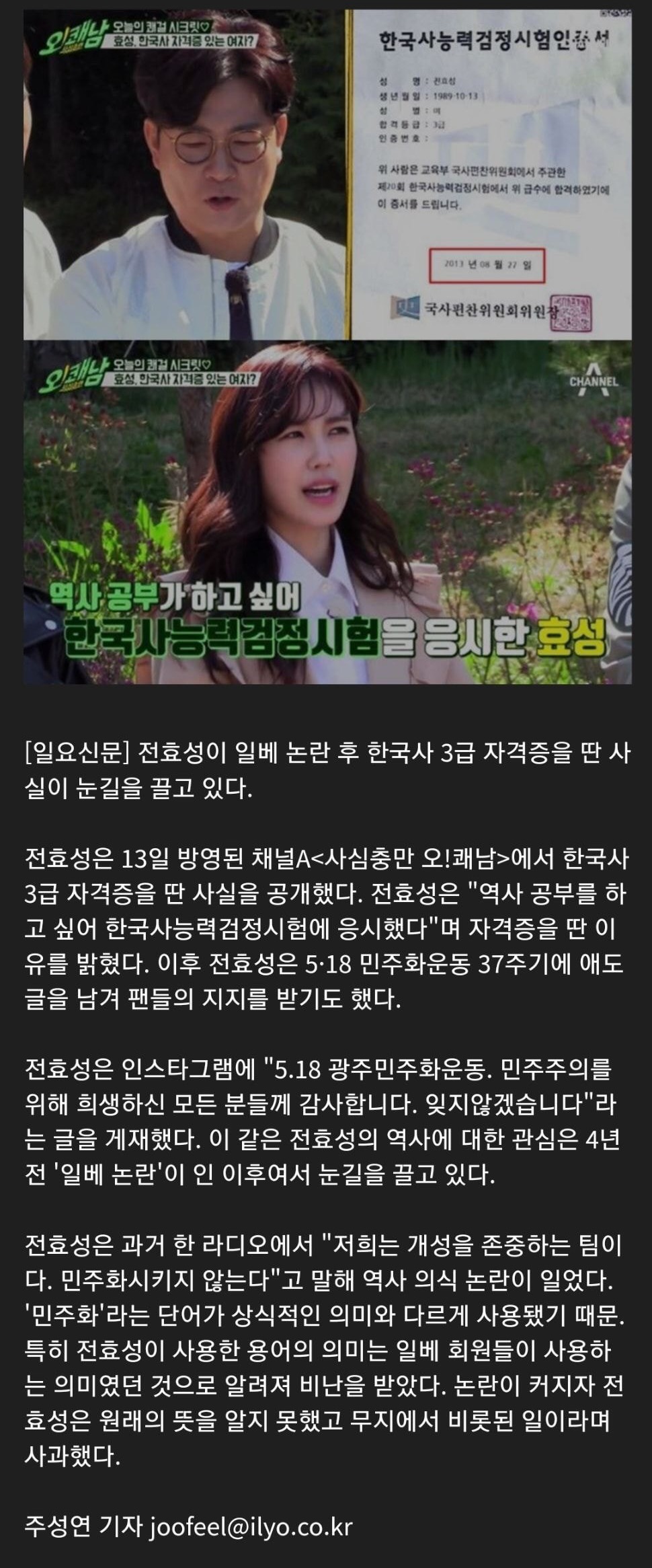 전효성 일베 논란 후 5.18발언이나 한국사 3급 자격증까지 진정한 반성이란 이런것이다 라는 것을 보여준 사람.